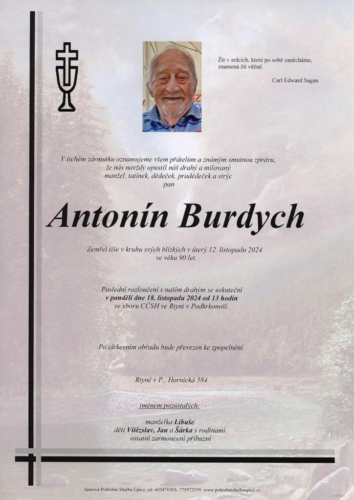 Poslední rozloučení s Antonínem Burdychem proběhne v pondělí 18. listopadu 2024 ve 13 hodin ve sboru CČSH ve Rtyni v Podkrkonoší.