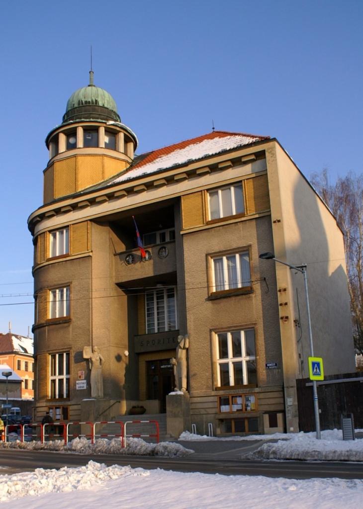 Nová městská spořitelna jest velmi vkusně řešena a jest skutečnou ozdobou Masarykova náměstí i celého města. Zvláštností její jest betonová (železo) kabina v suterénu, kolem níž možno obejíti, avšak zrcadlové plochy stále ukazují, kde se přítomný nachází. Vstup do kabiny děje se zvláštními těžkými vraty s patentním zámkem. Dveře samočinně zapadající se nedají zevnitř otevírati. Může se tudíž díti přístup dovnitř jen za přítomnosti dvou osob. Kabina má safes pro ukládání peněz, cenných papírů, klenotů apod. buď pro spořitelnu, nebo pro jednotlivce za poplatek. Z bližších peněžních ústavů má podobnou kabinu jedině spořitelna města Náchoda.